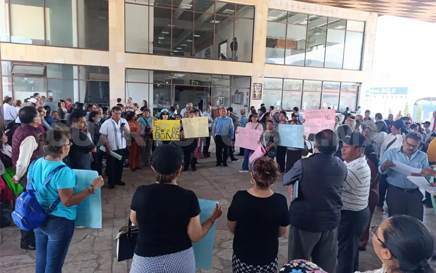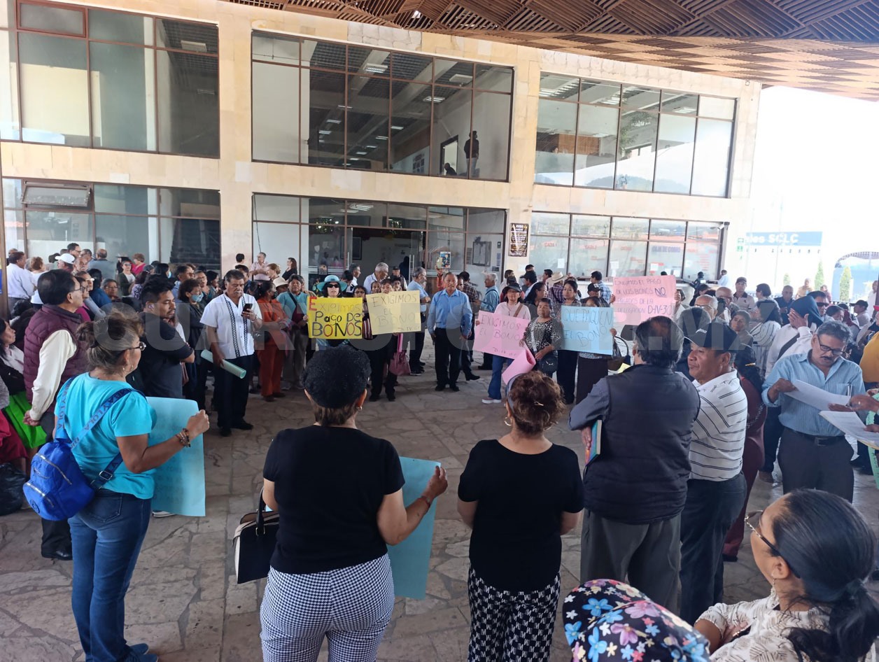 Cientos de maestros jubilados de la Sección VII del Sindicato Nacional de Trabajadores de la Educación (SNTE), se manifestaron este viernes frente al Ayuntamiento de San Cristóbal de Las Casas para exigir el pago de un bono correspondiente de 2018 a la fecha.