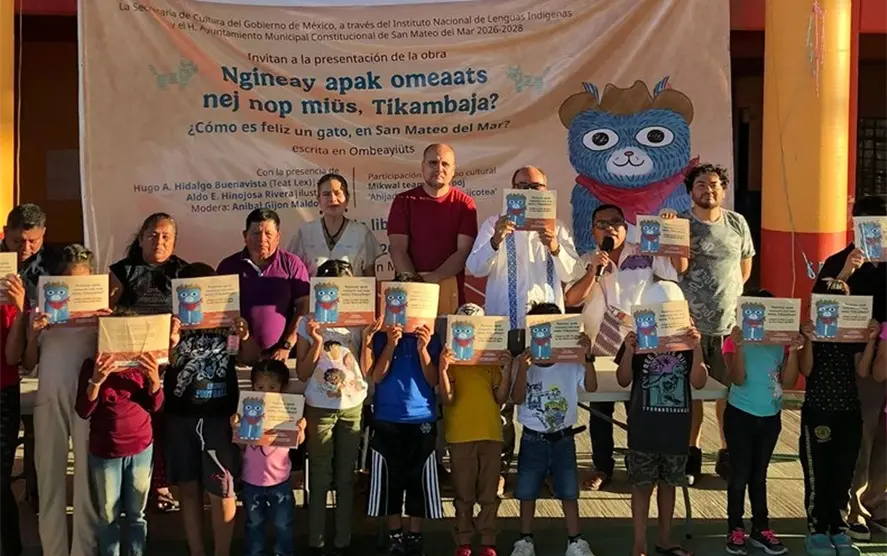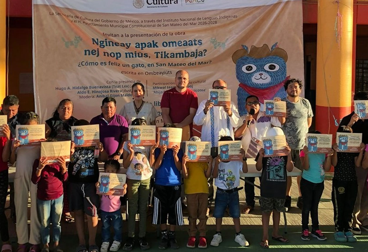 El primer evento se llevó a cabo en la explanada municipal de San Mateo del Mar, donde se entregó el texto bilingüe, escrito en las lenguas ombeayiüts y español, Ngineay apak omeaats nej nop miüs, Tikambaja? ¿Cómo es feliz un gato, en San Mateo del Mar?, resultado del trabajo creativo de Hugo Alberto Hidalgo Buenavista, autor de la obra y hablante de este idioma, junto con el ilustrador Aldo Hinojosa. También participó María Fernanda Ramírez Acevedo, quien colaboró en los gráficos.