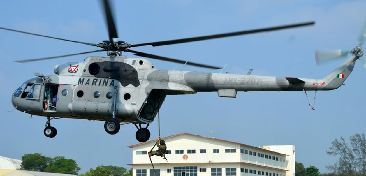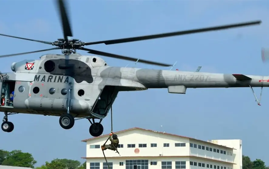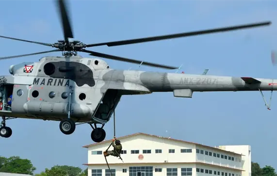 Elementos de la Secretaría de Marina-Armada de México llevaron a cabo ejercicios de adiestramiento de inserción vertical mediante técnica de soga rápida, para lo cual se hizo uso hasta de un helicóptero.